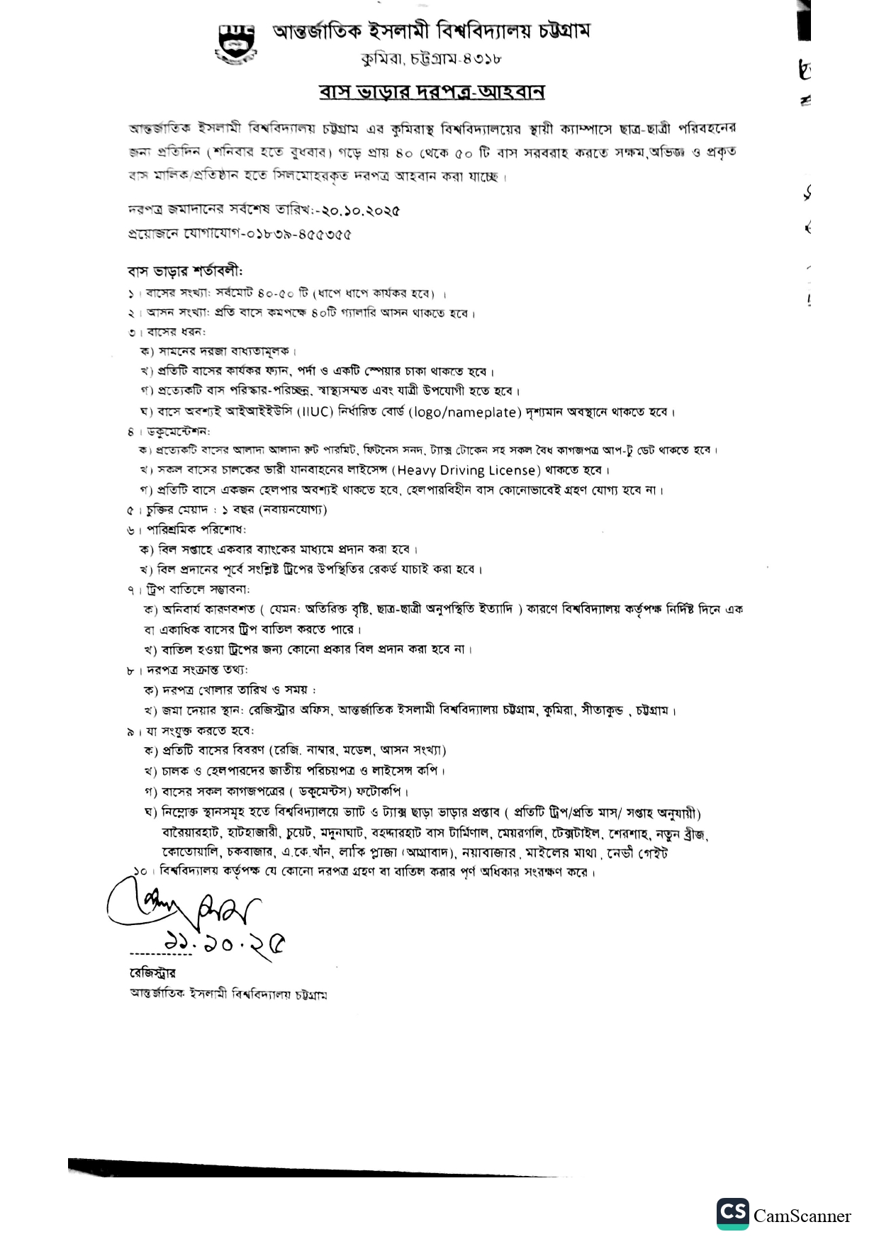 বাস ভাড়ার দরপত্র আহ্বান